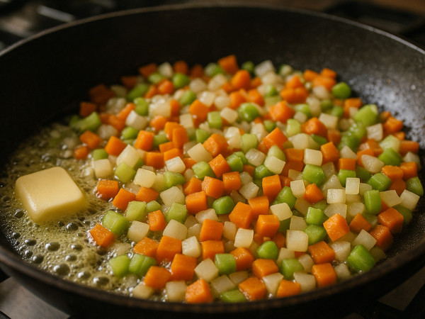 Melt the butter in a large skillet over medium-high heat. Toss in the onions, carrots, celery, peppercorns, and cloves, and cook everything together until the onions turn a nice golden brown, about 7 to 10 minutes. Sprinkle the flour over the veggies and stir it in well, cooking for a minute or two until it’s fully combined.
