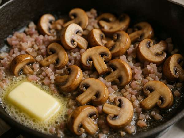 Melt 2 tablespoons of butter in a large skillet over medium heat. Toss in the shallot and cook, stirring now and then, until it turns a nice deep golden brown—this should take about 2 to 3 minutes. Next, add the mushrooms, garlic, salt, and pepper. Keep stirring occasionally until the mushrooms get a good brown color, around 3 to 5 minutes.