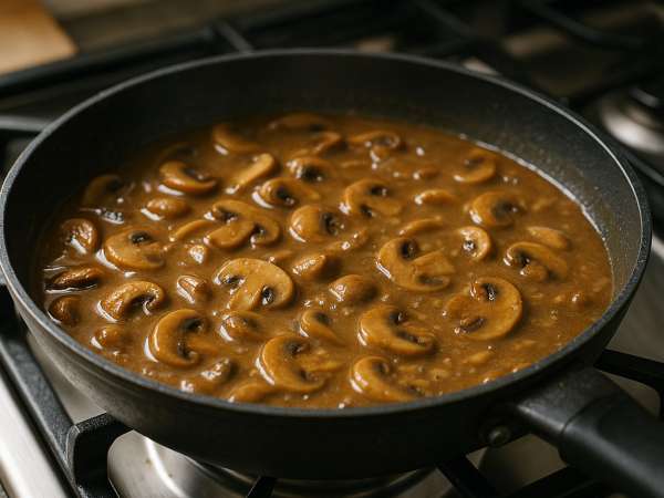 Crank the heat back up to medium-high and add the mushroom mixture back into the pan. Let everything come to a boil, then reduce the heat to low and let it simmer uncovered for about 8 minutes, so the flavors meld and the gravy thickens. Finish by stirring in the soy sauce, then taste and adjust the seasoning if you need to.