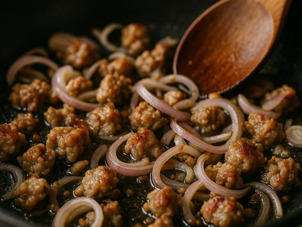 While the veggies are roasting, warm up a large skillet over medium-high heat. Add the sausage and shallot, cooking until the sausage is browned and crumbly, which should take around 5 to 7 minutes. Drain off any excess grease.