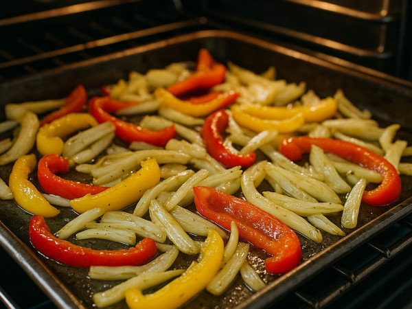 Gently heat your oven to 475°F. Toss the bell peppers and fennel with some oil and thyme, then spread them out on a baking sheet. Pop them in the oven and roast until they’re nice and tender, about 8 to 10 minutes.