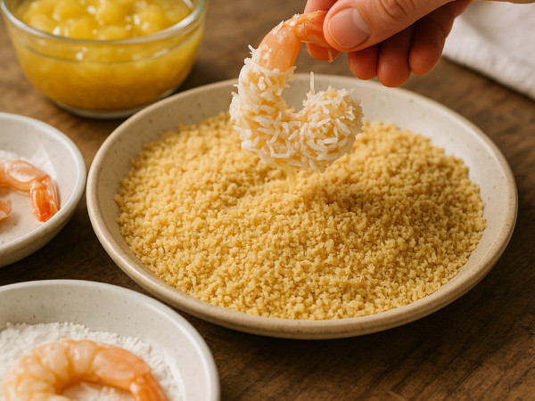 Gently heat your oven to 350°F (175°C). Get three bowls ready: one with cornstarch, another with egg whites and a splash of coconut extract beaten together until they’re almost fluffy, and a third mixing the breadcrumbs, shredded coconut, and a little sucralose.