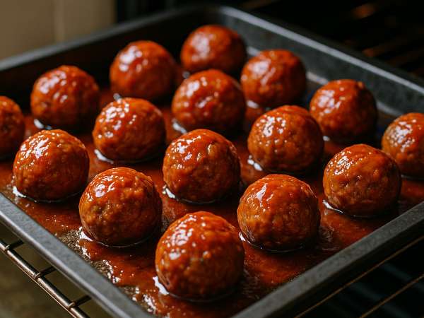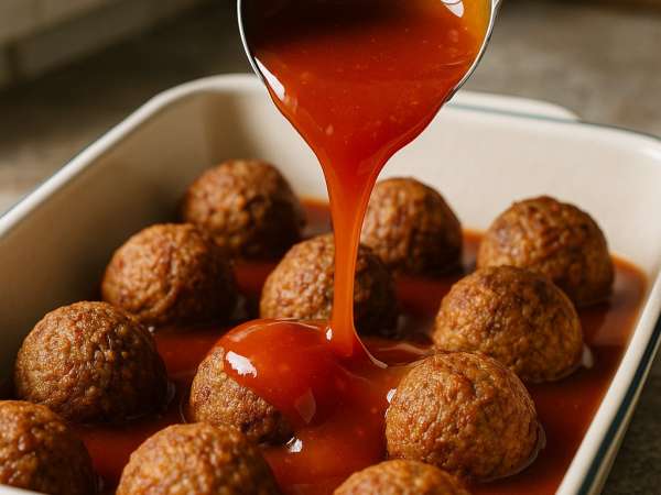 Shape the mixture into meatballs about 1 1/2 inches wide and arrange them in an 8-inch baking dish. In another bowl, whisk together grape jelly, ketchup, olive oil, vinegar, minced garlic, and oregano until smooth. Pour this sauce evenly over the meatballs.