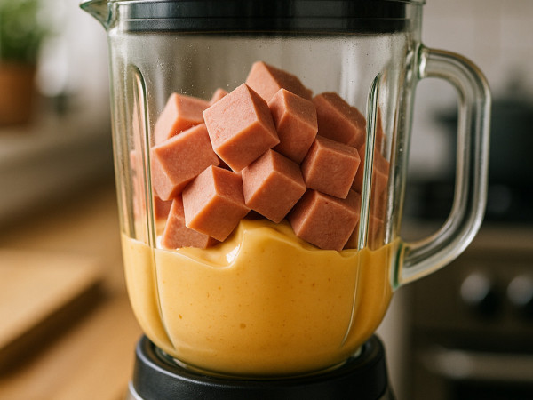 Combin the luncheon meat cubes, processed cheese sauce, pimientos, and sandwich spread in a blender. Pulse everything until it’s smooth, stopping occasionally to scrape down the sides so it blends evenly. Once the mixture is ready, transfer it to a bowl.