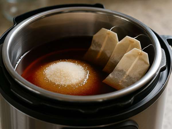 Pour 5 cups of water into your Instant Pot and add the sugar along with the tea bags. Close the lid and set the pot to high pressure for 5 minutes. It will take about 10 to 15 minutes for the pressure to build up before the timer starts.