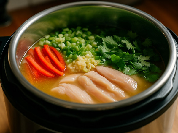 Ad the chicken, chicken broth, water, coconut cream, garlic chile paste, coconut aminos, lime juice, salt, ginger, and basil into your Instant Pot or any similar pressure cooker. Secure the lid and make sure it’s locked in place. Set the cooker to the Soup or Broth setting and let it cook for 30 minutes. It will take about 10 to 15 minutes for the pressure to build up before the cooking time begins.