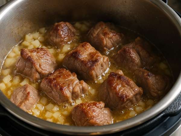 Tos the lamb with the flour in a bowl until it’s nicely coated. Turn your Instant Pot to the sauté setting and heat the oil until it’s shimmering. Add the lamb and brown it on all sides, which should take about 5 to 7 minutes. Then, throw in the onion and cook until it softens, around 3 minutes. Pour in the broth and use a spoon to scrape up all those tasty browned bits from the bottom.