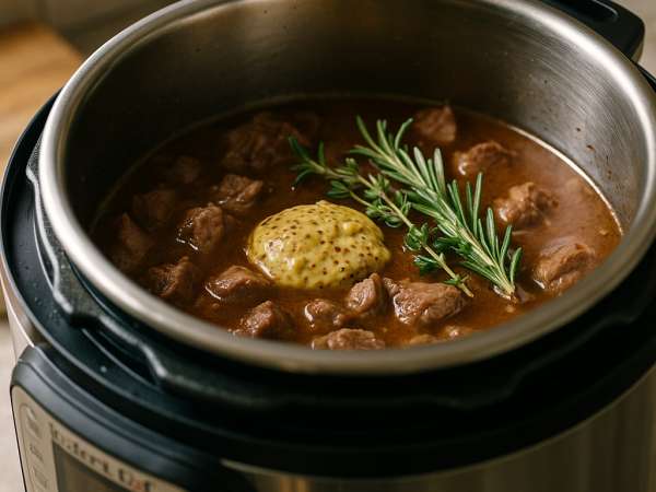 Stir in the mustard, thyme, rosemary, salt, and pepper. Lock the lid in place and set the pressure cooker to manual for 20 minutes. It’ll take about 10 to 15 minutes for the pressure to build. When the time’s up, carefully do a quick release to let the steam out, then open the lid.