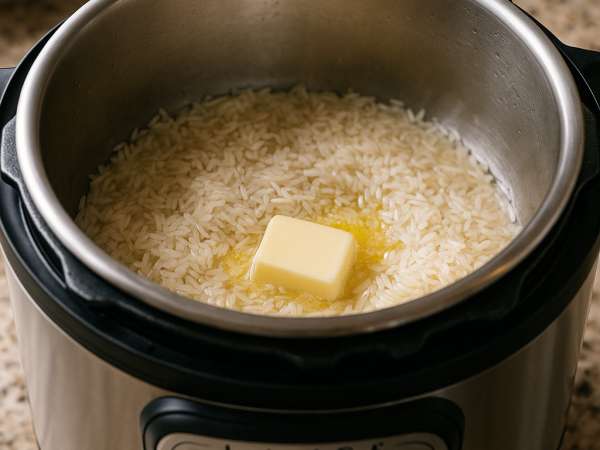 Turn on your Instant Pot to the sauté setting and add the butter. Once it’s melted and sizzling, stir in the rice and cook it for a couple of minutes, stirring now and then, until the grains look translucent. Pour in the water, chicken broth, lime juice, and sprinkle in some salt. Give everything a quick stir, then close the lid and set the pot to high pressure for 4 minutes. It will take about 10 minutes to come up to pressure.