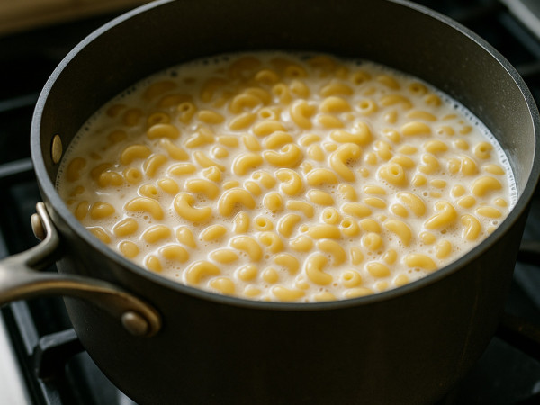 Heat the milk, salt, cayenne, mustard, nutmeg, and a tablespoon of butter in a pot over medium heat until it’s just about to simmer. Once it’s hot, stir in the macaroni. Let it cook gently, stirring now and then, until the pasta is tender but still has a little bite—this should take around 8 minutes, so don’t rush it.