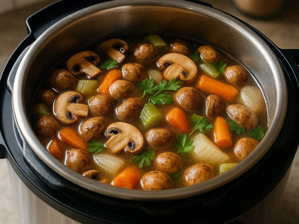 Ad the mushrooms, onion, carrot, celery, salt, bay leaf, and water into your Instant Pot or any similar pressure cooker. Secure the lid and set it to cook on high pressure for 30 minutes. It will take some time for the pressure to build up, so be patient. Once the cooking time is up, let the pressure release naturally—this usually takes around 30 minutes. When it’s safe to open, carefully remove the lid. Let the broth cool down for about 20 minutes, then strain it through a fine mesh sieve, discarding the vegetables and herbs. Your mushroom broth is ready to use!