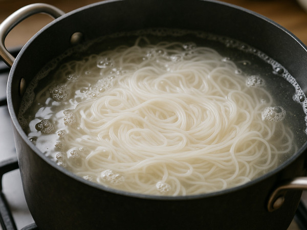 Bring a large pot of lightly salted water to a boil. Add the rice vermicelli and cook it uncovered, stirring now and then, following the package instructions—usually around 5 to 6 minutes depending on the thickness. Once cooked, drain the noodles and rinse them under cold water to stop the cooking and keep them from sticking.