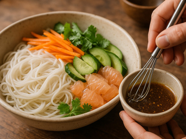 Transfer the noodles to a big bowl, then toss in the pomelo, carrot, cucumber, scallions, and cilantro. In a separate small bowl, mix together the fish sauce, water, Thai sweet chili sauce, brown sugar, and rice vinegar. Pop the dressing in the microwave for about 20 seconds to help dissolve the sugar, then give it a quick whisk.