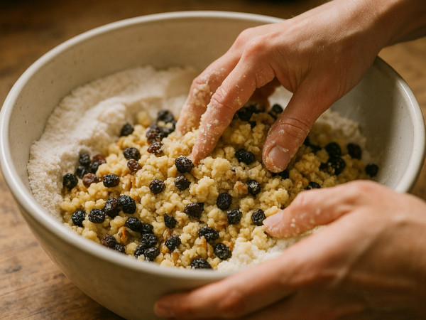 Heat your oven to 400°F (200°C). Mix the thawed orange juice concentrate with some water to dilute it. In a large bowl, cut the butter into the flour until it looks like coarse crumbs. Then, add the walnuts, sugar, raisins, orange juice mixture, orange zest, and a pinch of salt. Use your hands to mix everything together, adding a little more flour if the dough feels too sticky.