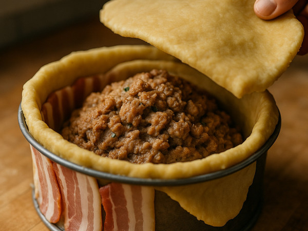 Line the inside of the chilled crust with streaky bacon, then press in half of the pork mixture. Add a few more slices of bacon on top, press in the rest of the meat, and finish with the remaining bacon. Brush the edges of the pastry with a little milk, place the top crust over it, and seal the edges by pinching them together. Give the top a milk wash and cut a couple of slits to let steam escape.