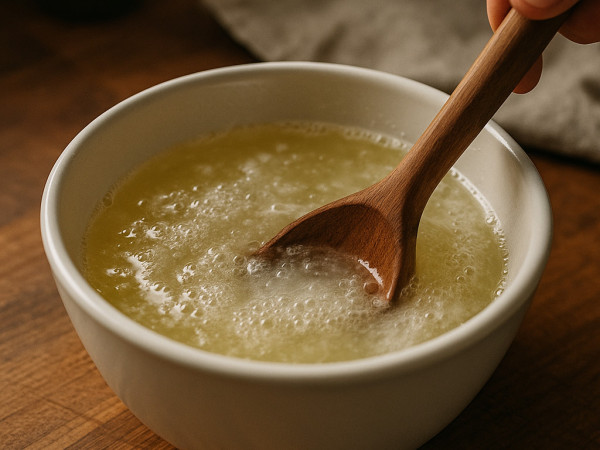 Melt the lard in a large microwave-safe bowl—about 30 seconds to a minute should do it. Once melted, carefully stir in the boiling water. In another big bowl, mix the flour and salt together, then make a well in the center and pour in the lard mixture. Use a wooden spoon to stir everything until you get a smooth, slightly sticky dough.