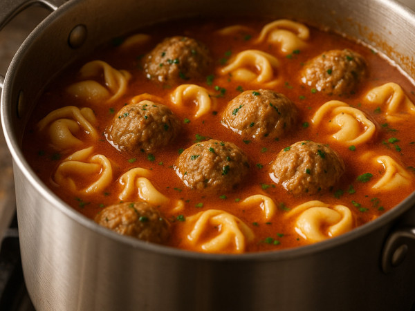 Bring the beef broth to a boil in a large pot, then stir in the tomato sauce. Carefully drop the meatballs into the pot, reduce the heat to medium, and let everything simmer. Keep an eye on it and skim off any oily spots that rise to the surface. Let it cook gently for about an hour.