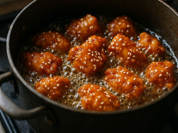 Once all the chicken is fried, pour the honey sauce into a large skillet and warm it over medium heat until it starts to simmer, about 3 to 4 minutes. Toss the chicken in the sauce, turning to coat every piece nicely. Finish by sprinkling sesame seeds over the top, and you’re ready to serve.