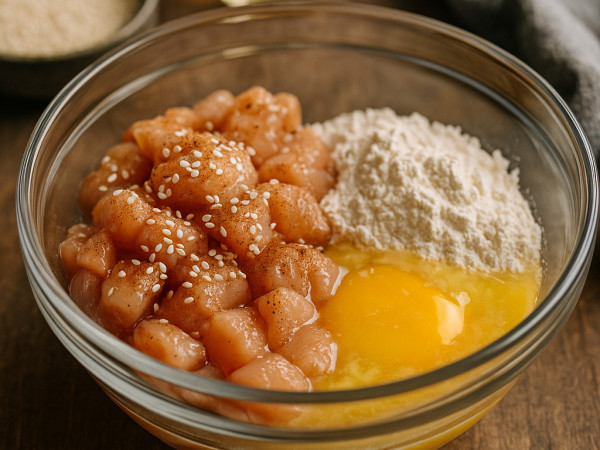 Season the chicken pieces with a quarter teaspoon each of salt and garlic powder. In a large bowl, whisk the egg with the remaining salt and garlic powder, then add the flour and mix well. In a separate bowl, combine water and cornstarch, and stir this into the egg and flour mixture. Finally, mix in the avocado oil and baking powder until everything is well combined.