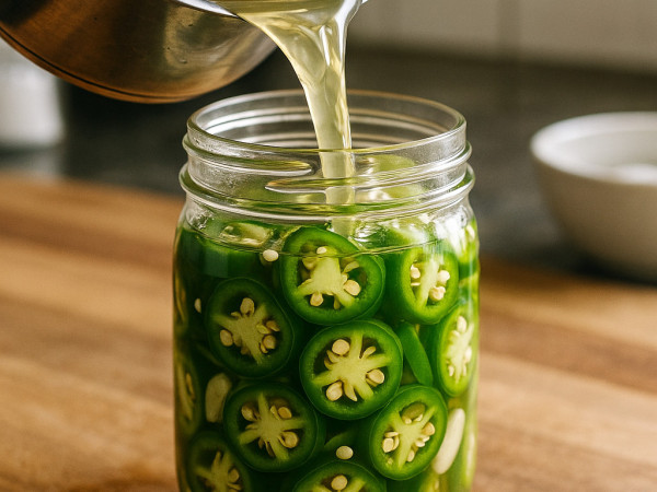 Carefully place the jalapeños into the sterilized jar. Pour the slightly cooled brine over the peppers, leaving about half an inch of space at the top so things have room to expand. Screw the lid on tightly and pop the jar in the fridge.