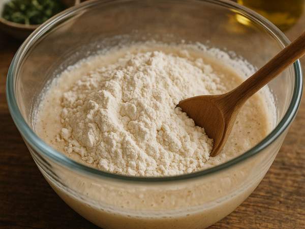 Whisk 5 tablespoons of warm water with the yeast and sugar in a big bowl. Let it sit for about 10 minutes until it gets creamy and bubbly. Next, add the flour and a pinch of salt to the yeast mixture and stir everything together. If the dough feels too dry, add a tablespoon of water at a time until it comes together into a soft dough.