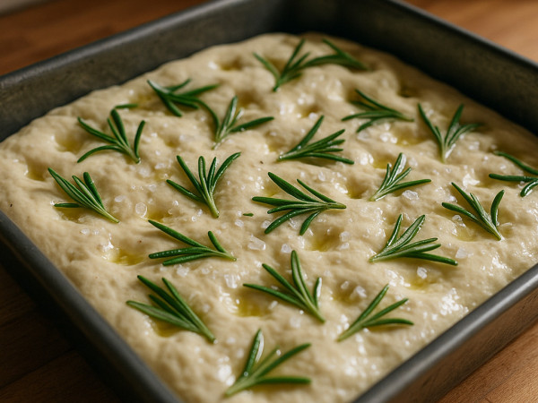 Use your fingertips to press dimples all over the surface of the dough. Sprinkle on the rosemary leaves and a little extra salt to taste. Pop it into the oven and bake until it’s just the way you like it — around 10 minutes for a soft, fluffy focaccia or closer to 20 minutes if you prefer it crispier and more golden.