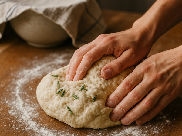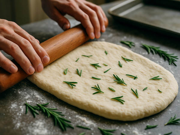 While the dough is rising, preheat your oven to 465°F (240°C) and lightly grease a baking sheet. Once the dough has risen, gently punch it down and turn it out onto a floured surface again. Knead it quickly, then flatten or roll it out into a rough rectangle that fits your baking sheet. Transfer it over and brush the top with olive oil.