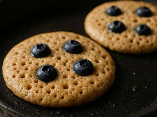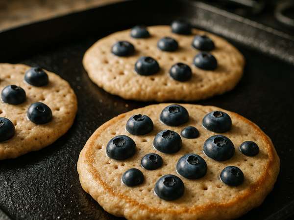 Heat a lightly oiled griddle or non-stick pan over medium-high heat. Once it’s hot, drop large spoonfuls of batter onto the surface. Sprinkle some blueberries on top of each pancake right away.