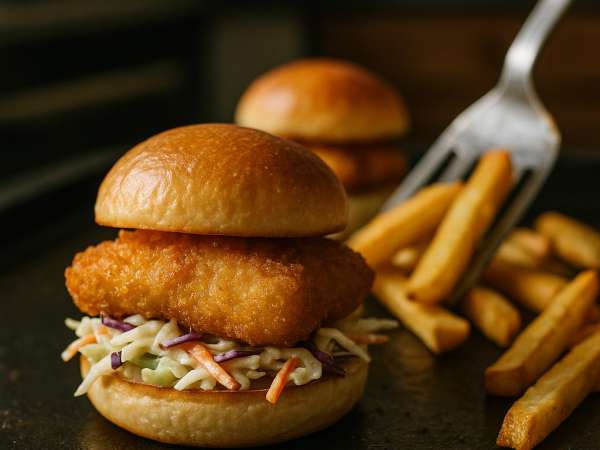 When everything’s ready, assemble your sliders by placing a piece of fish on the bottom half of each bun and topping it with a generous scoop of coleslaw. Enjoy!