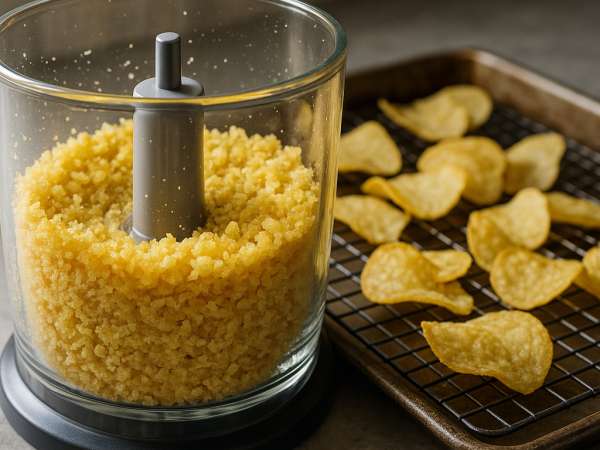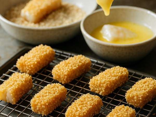 Gently heat your oven to 450°F (230°C). Set a wire rack on a baking sheet and give it a quick spray with cooking spray so the fish doesn’t stick. Next, take your chips and pulse them in a blender until they turn into coarse crumbs—kind of like homemade breadcrumbs. Spread those crumbs out on a plate.