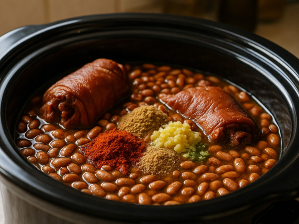 Put the pinto beans in a large slow cooker and cover them with water. Let them soak for about 3 to 4 hours while you get the rest ready. Next, blend the jalapenos and garlic in a food processor until it forms a smooth paste. Drain the soaked beans and put them back into the slow cooker. Stir in the jalapeno-garlic paste, then tuck the ham hocks in among the beans. Scatter the onion chunks on top, along with salt, cayenne, black pepper, and paprika. Lay the bacon and green chiles over everything. Cover the slow cooker and let it cook on low for around 10 hours. When it’s done, take out the ham hocks and let them cool just enough to handle, then shred the meat. Add the shredded ham and any fat back into the beans, stirring everything together so the fat melts in and makes the beans nice and creamy. You can either keep it warm or turn the slow cooker off until you’re ready to eat.