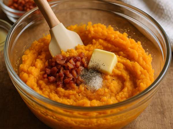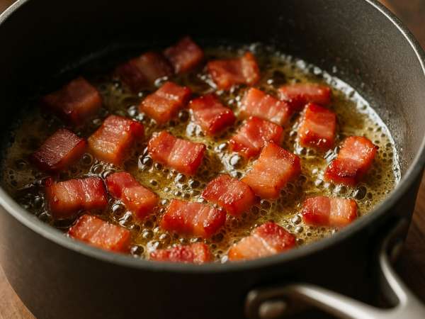 Once your dough is ready, melt the butter in a saucepan over medium heat. Toss in the bacon and cook it, stirring occasionally, until it starts to get crispy—about 3 to 5 minutes.