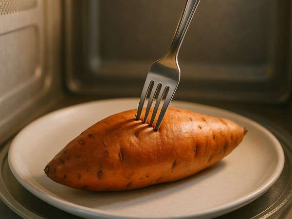 Prick the sweet potato all over with a fork and popping it on a microwave-safe plate. Microwave it for about 8 to 10 minutes, or until it’s completely soft. Let it cool just enough so you can handle it.