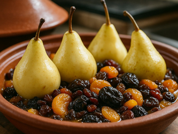 Arrange your pears standing upright in a tagine or similar oven-safe dish. Nestle prunes, apricots, almonds, and the lemon peel around and on top of the pears as needed. Pour the lemon syrup over everything, making sure the cinnamon stick and vanilla bean halves end up in the dish. Cover it up and pop it in the oven.