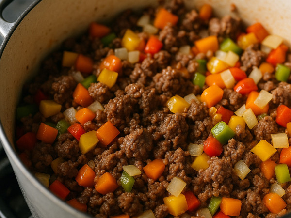 Heat some vegetable oil in a large Dutch oven over medium heat. Once hot, add the ground venison and cook it until it’s nicely browned, which should take about 5 to 7 minutes. Toss in the chopped bell peppers, carrots, and onion, and cook everything together until the onion turns translucent, around 3 minutes. Then, stir in the garlic and let it cook just until you can smell its aroma, about 30 seconds.