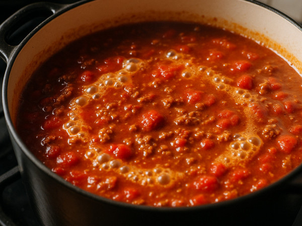 Bring the chili up to a gentle simmer, stirring now and then to keep everything from sticking. Lower the heat to medium-low and let it cook slowly for about 30 to 45 minutes, allowing all the flavors to meld together. Before serving, taste and adjust the seasonings if needed, then fish out and discard the bay leaves.