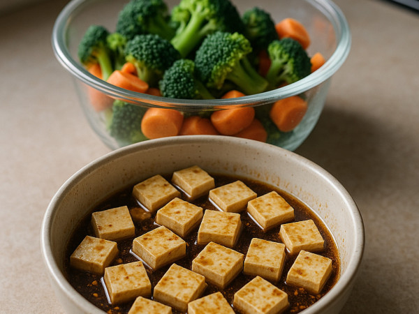 Blend the tofu with a tablespoon of oil, curry powder, salt, and pepper in a bowl. Let it sit for about 30 minutes to soak up all those flavors. While the tofu is marinating, steam the broccoli and carrots by placing them in a microwave-safe bowl with a tablespoon of water and a pinch of salt. Cover and microwave for around 2 and a half minutes until tender.