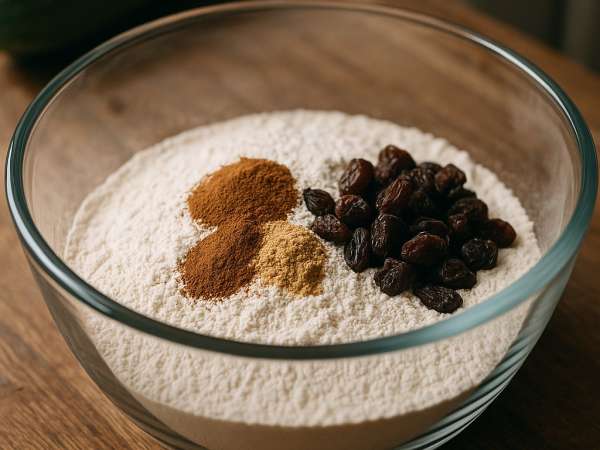 In another bowl, sift together the oat flour, all-purpose flour, baking powder, cinnamon, nutmeg, salt, and baking soda. Toss in the raisins, then gradually add the dry ingredients to the zucchini mixture. Stir just until everything comes together—try not to overmix.