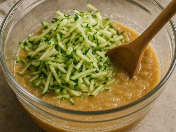 Lightly heat your oven to 350°F (175°C) and lightly grease two muffin pans. In a large bowl, mix the warm water and flaxseed together, then add the sugar, applesauce, oil, and vanilla extract. Give it a good stir, then fold in the shredded zucchini until everything is well combined.