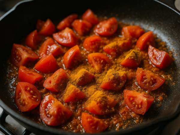 Add the tomatoes and cook everything together for 3 to 4 minutes until the mixture softens. Sprinkle in the coriander powder, turmeric, and chili powder, then let the sauce simmer and thicken for 3 to 5 minutes. Season with salt, then add the mushrooms, stirring well to coat them in the sauce.