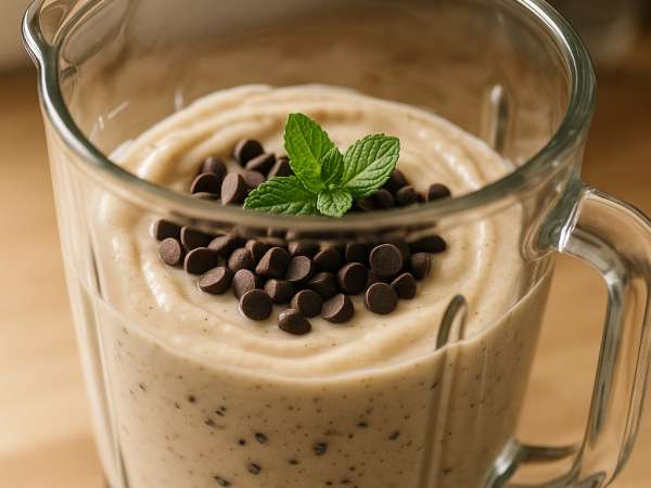 Soak the cashews in a bowl of water for anywhere from an hour to three hours, then drain them well. Next, toss the soaked cashews into a blender along with the banana, ice cubes, tofu, dates, mint extract, and a teaspoon of soy milk. Blend everything until it’s nice and smooth. If the mixture feels too thick to blend properly, add a little more soy milk—just enough to help it along without thinning it out too much. Once the base is creamy and smooth, fold in the chocolate chips. Scoop it into a bowl, and it’s ready to enjoy!