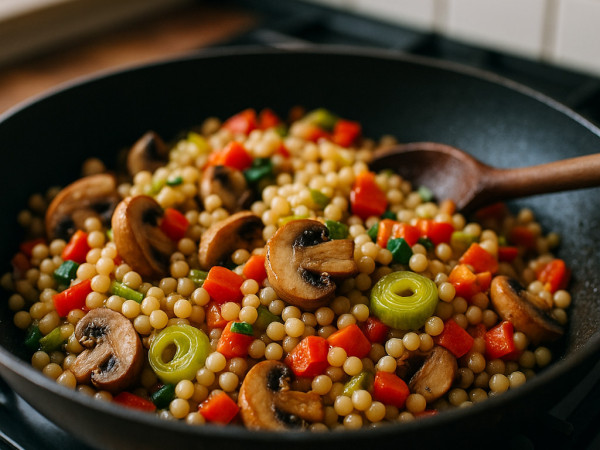 At the same time, warm a little oil in a skillet over medium-high heat. Toss in the mushrooms, leek, and bell pepper, and sauté everything until the veggies soften up nicely, about 5 minutes. Once the couscous is ready, mix it into the skillet with the veggies so all those flavors come together.