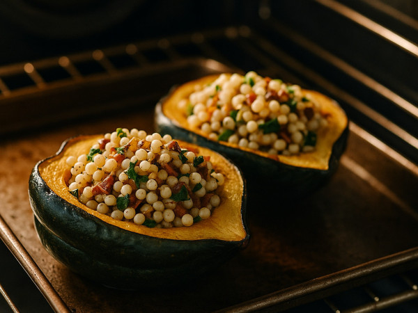 Finally, take the squash out of the oven and fill each half with the couscous and vegetable mixture. Serve warm and enjoy!