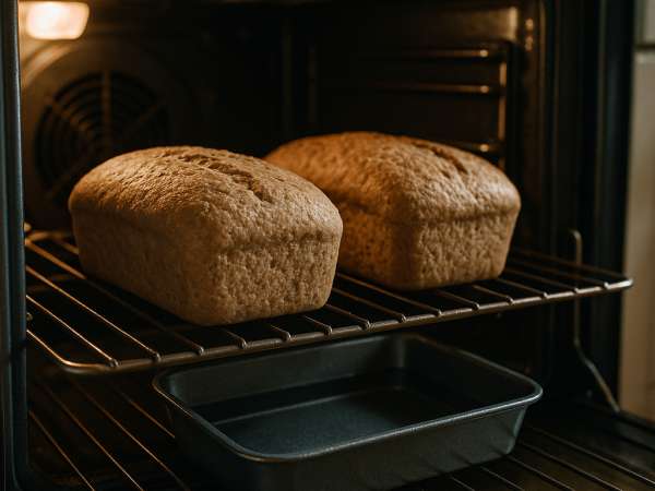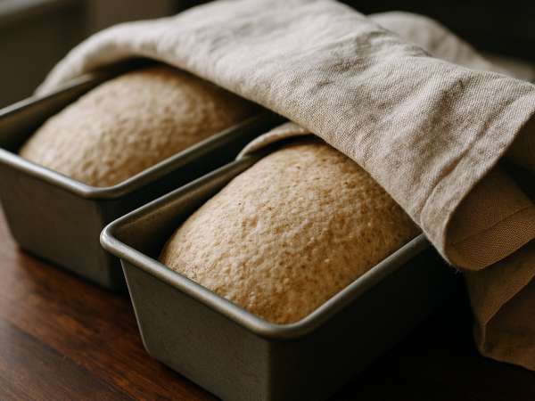 When you’re ready to bake, take the dough out of the fridge a couple of hours ahead so it can come to room temperature. Turn it out onto a floured surface, sprinkle a bit of flour on top, and divide it in half. Flatten each piece gently, then fold all four sides in toward the center, pinching the edges to seal. Shape each half into a smooth loaf and place them in greased loaf pans. Cover with a clean towel and let them rise until they’re just peeking over the edges of the pans, about 45 minutes to an hour.