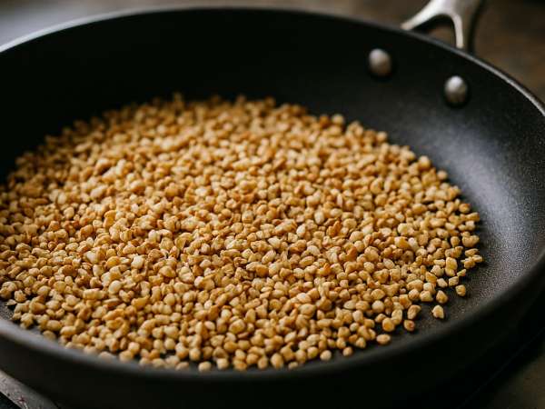 Heat a heavy skillet over medium heat. Toss in the steel-cut oats and cook, stirring frequently, until they smell toasty and turn a light golden color—this should take about 5 minutes. Take them off the heat and set aside.