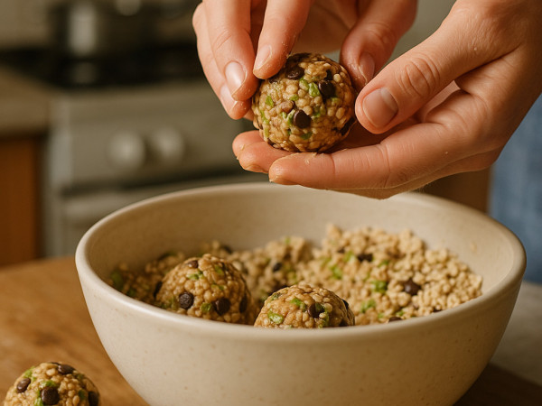 Tos the oats, almond butter, grated zucchini, chocolate chips, honey, flaxseed meal, and cinnamon together in a big bowl until everything is well mixed. Once combined, scoop out the mixture and roll it into about 18 small balls—bite-sized is perfect. Place the little treats in a container, then pop it in the fridge for about an hour so they can firm up. After that, they’re ready to enjoy!